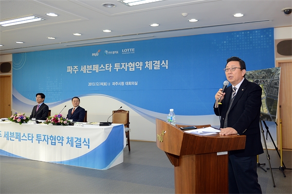 ·Ôµ¥¼îÇÎ(´ëÇ¥ÀÌ»ç ½ÅÇå)Àº ¹®¹ßµ¿ ÀÏ¿ø¿¡ ¡®ÆÄÁÖ ¼¼ºìÆä½ºÅ¸(Seven Festa*7°¡Áö ÃàÁ¦ÀÇ °ø°£)¡¯À» °Ç¼³Çϱâ·Î Çϰí 14ÀÏ ½Ãû ȸÀǽǿ¡¼­ ±è¹®¼ö °æ±âµµÁö»ç, ÀÌÀÎÀç ½ÃÀåÀÌ Âü¼®ÇÑ °¡¿îµ¥ ¡®ÆÄÁÖ ¼¼ºìÆä½ºÅ¸¡¯ ÅõÀÚ Çù¾àÀ» ü°áÇß´Ù.