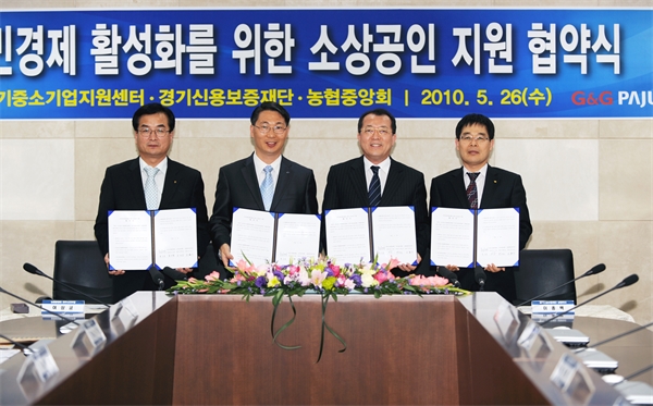 À̳¯ Çù¾à¿¡´Â È«½ÂÇ¥ ºÎ½ÃÀå, °æ±âÁß¼Ò±â¾÷Áö¿ø¼¾ÅÍ(ÀÌ»çÀå È«±âÈ­)¿Í °æ±â½Å¿ëº¸ÁõÀç´Ü(ÀÌ»çÀå ¹ÚÇØÁø), ³óÇùÁß¾Óȸ ÆÄÁÖ½ÃÁöºÎ(ÁöºÎÀå ¿©»ó±Ã) °ü°èÀÚ°¡ Âü¼®, Çù¾à¼­¿¡ ¼­¸íÇß´Ù.