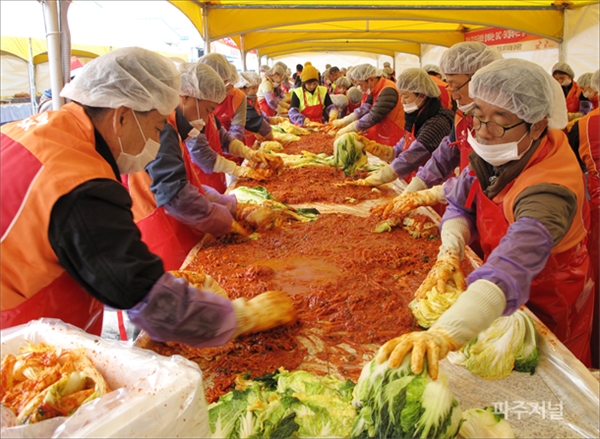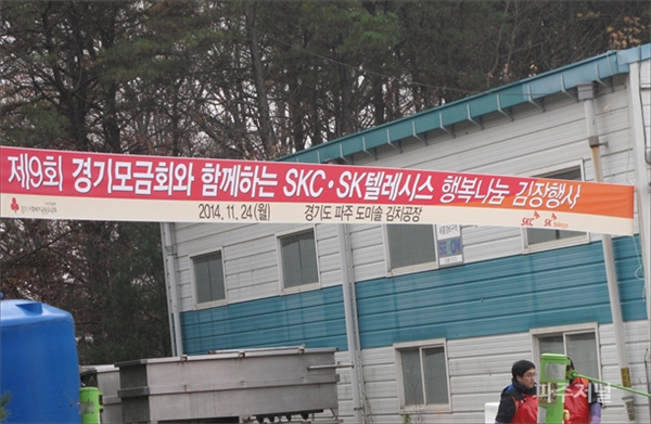 SKC¿Í SKÅÚ·¹½Ã½º°¡ 24ÀÏ ÆÄÁÖÀ¾ ºÎ°î¸® µµ¹Ì¼Ö½Äǰ¿¡¼ °æ±â»çȸº¹Áö°øµ¿¸ð±Ýȸ¿Í ÇÔ²² ¡®14 SKC/SK ÅÚ·¹½Ã½º Çູ³ª´® ±èÀåÇà»ç¡¯¸¦ ÁøÇàÇß´Ù. ¡®Çູ³ª´® ±èÀåÇà»ç¡¯´Â SKC¿Í SKÅÚ·¹½Ã½º°¡ °Ü¿ïö Çʼö ¸Ô°Å¸®ÀÎ ±èÀå±èÄ¡¸¦ ÀÓÁ÷¿øµéÀÌ Á÷Á¢ ´ã°¡ ºÒ¿ìÀÌ¿ôµé¿¡ Àü´ÞÇϸç, ¾ç»çÀÇ ´ëÇ¥Àû °øµ¿ »çȸ°øÇåȰµ¿ Áß Çϳª·Î ¿ÃÇØ·Î 9³â° ¸Å³â ½Ç½ÃÇϰí ÀÖ´Ù. À̳¯ Çà»ç¿¡´Â Ãֽſø SKC ȸÀå°ú °æ±â»çȸº¹Áö°øµ¿¸ð±Ýȸ Á÷¿ø, ¼ö¿ø»ó°øÈ¸ÀÇ¼Ò Á÷¿ø, SKC, SKÅÚ·¹½Ã½º Á÷¿ø µî 150¿©¸í°ú ¸ð±Ýȸ, ¼ö¿ø»ó°øÈ¸ÀǼÒ, °æÈñ´ëÇб³ ±³¼ö ¹× ±³Á÷¿ø, ±×¸®°í °æÈñÀÇ·á¿ø °£È£»ç µî 30¿©¸í, °æ±â»çȸº¹Áö°øµ¿¸ð±Ýȸ È«º¸´ë»ç·Î Ȱµ¿Çϰí ÀÖ´Â °¡¼ö Çö¼÷¾¾¸¦ ºñ·ÔÇØ °¡¼ö ³²±Ã¿ÁºÐ, ¹æ¼ÛÀÎ ±èÇý¿µ¾¾ µî °¢°è°¢ÃþÀÌ Á¤¼ºÀ» ¸ð¾Æ ±èÀå±èÄ¡ 1¸¸ Æ÷±â(¾à25Åæ)¸¦ ´ã°¬´Ù.