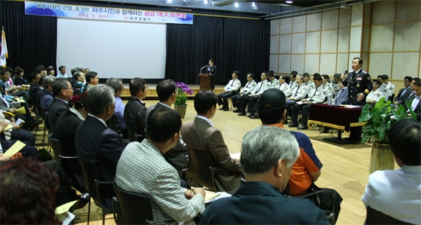 °æÂûÀÌ '4´ë¾Ç ±ÙÀý'À» À§ÇØ ¹ß¹þ°í ³ª¼¹´Ù. ´ëÅä·Ðȸ´Â ½Ã¹Î°ú °æÂû °£ÀÇ ¼ÒÅëÀ» ÅëÇÑ °ø°¨´ë¸¦ Çü¼º, ¡®4´ë »çȸ¾Ç ±ÙÀý¡¯ ºÐÀ§±â¸¦ Á¶¼ºÇϱâ À§ÇØ ¸¶·ÃµÆÀ¸¸ç ±è¼º¼· ¼ÀåÀ» ºñ·ÔÇÑ °æÂû °ü°èÀÚ¿Í ½Ã¹Î*»çȸ´Üü °ü°èÀÚ µî 200¿©¸íÀÌ Âü¼®Çß´Ù. ´ëÅä·Ðȸ´Â ½Ã¹ÎµéÀÇ »ý»ýÇÑ ¸ñ¼Ò¸®¸¦ ÇöÀå¿¡¼ µè°í °æÂû¾÷¹«¿¡ ¹Ý¿µ, ¡®4´ë »çȸ¾Ç¡¯ µî ¹üÁ˷κÎÅÍ ¾ÈÀüÇÑ »ýȰÀ» ÇÒ ¼ö ÀÖ´Â ±â¹Ý Á¶¼ºÀ» À§ÇØ ¿·Á Åä·Ðȸ ºÐÀ§±â´Â ½ÃÁ¾ ¶ß°Å¿î ¿±â·Î °¡µæÇßÀ¸¸ç Åä·Ðȸ Áß°£ µ¹¹ßÄûÁ ÅëÇØ Áï¼®»óǰÀ» ÁõÁ¤ÇÏ´Â À̺¥Æ®µµ °¡Á® Âü¼®ÀÚ¿¡°Ô »ö´Ù¸¥ Áñ°Å¿òµµ ¼±»çÇß´Ù. ±è¼º¼· ¼ÀåÀº Àλ縻À» ÅëÇØ ¡°à»éØýÕ¥(¼±¿ìÈĶô)ÀÇ ÀÚ¼¼·Î ½Ã¹ÎÀÌ ±Ù½ÉÇϱâ Àü¿¡ °æÂûÀÌ ¸ÕÀú ±Ù½ÉÇϰí, ½Ã¹ÎÀÌ Áñ°Å¿öÇÑ µÚ °æÂûÀÌ Áñ°Å¿öÇÏÀÚ´Â ¸¶À½°¡ÁüÀ¸·Î ½Ã¹ÎÀÇ ÀÔÀå¿¡¼ ¼¼½ÉÇÏ°Ô º¸»ìÇÇ´Â °íǰ°Ý Ä¡¾È¼ºñ½º¸¦ âÃâÇϰڴ١±¸é¼ ¡°4´ë »çȸ¾Ç ±ÙÀýÀ» À§ÇØ ½Ã¹ÎµéÀÇ Àû±ØÀûÀÎ Âü¿©¿Í °ü½ÉÀÌ ÇÊ¿äÇÏ´Ù¡±°í ´çºÎÇß´Ù.