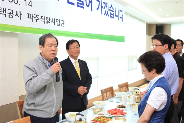 ÀÌÁö¼Û Çѱ¹ÅäÁöÁÖÅðø»ç(LH) »çÀåÀÌ 14ÀÏ ÆÄÁÖ»ç¾÷´ÜÀ» ¹æ¹®, ¿îÁ¤3Áö±¸ Áֹεé°ú ´ëÈÀÇ ½Ã°£À» °¡Á³´Ù. ÀÌ ÀÚ¸®¿¡¼ ÀÌÁö¼Û »çÀåÀº "¿îÁ¤3Áö±¸´Â Àú°¡ º¸»óÀÌ ÀÖÀ» ¼ö ¾ø´Ù"´Â ÀÔÀåÀ» ¹àÇû´Ù.