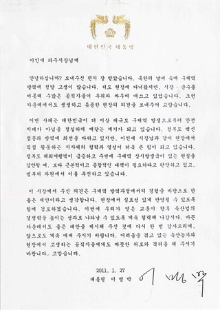 ±¸Á¦¿ª ÆÄµ¿°ú °ü·Ã, ÀÌÀÎÀç ½ÃÀåÀÌ Áö³ 25ÀÏ À̸í¹Ú ´ëÅë·É¿¡°Ô º¸³½ ¡®±¸Á¦¿ª ÅðÄ¡¸¦ À§ÇØ ´ëÅë·É´Ô²² ¿Ã¸³´Ï´Ù!¡¯¶ó´Â Á¦¸ñÀÇ ¼Çѹ®¿¡ ´ëÇØ ÀÌ ´ëÅë·ÉÀÌ Áö³ 27ÀÏÀÚ·Î ´ä½ÅÀ» º¸³»¿Ô´Ù. ÀÌ ´ëÅë·ÉÀº ¼Çѹ®¿¡¼ ¡®È¤ÇÑÀÇ ³¯¾¾¿¡µµ ±¸Á¦¿ª ¹æ¿ª¿¡ °í»ýÀÌ ¸¹°í °øÁ÷ÀÚµéÀÌ ÃßÀ§¿Í ½Î¿ì¸ç ¾Ö¾²°í ÀÖ´Â °¡¿îµ¥ »ý»ýÇÑ ÇöÀåÀÇ ÀǰßÀ» º¸³»ÁÖ¾î °í¸¿´Ù¡¯°í ÀüÁ¦ÇÏ°í ¡®±¸Á¦¿ª ¹ß»ýÀ¸·Î (´ëÇѹα¹ÀÌ) ±¸Á¦¿ª ¾ÈÀüÁö´ë°¡ ¾Æ´ÔÀ» Àý½ÇÈ÷ ±ú´Ý´Â °è±â°¡ µÆ´Ù¡¯°í ¹àÇû´Ù. ÀÌ ´ëÅë·ÉÀº ÀÌ¾î ¡®(ÀÌÀÎÀç ½ÃÀåÀÇ) ÇöÀå¿¡¼ Á÷Á¢ Ȱµ¿ÇÏ´Â Çù·Â°ú ¿¼ºÀÌ (±¸Á¦¿ª Á¾½Ä¿¡) Å« ÈûÀÌ µÇ°í ÀÖ´Ù¡¯¸ç ¡®ÀÌ ½ÃÀåÀÇ Á¦¾ÈÀ» ÁÁÀº »ý°¢À¸·Î ÇöÀå¿¡¼ ½ÇÈ¿¼º ÀÖ°Ô ¹Ý¿µµÉ ¼ö ÀÖµµ·Ï °ËÅäÇϰڴÙ.¡¯°í Á¤Ã¥ ¹Ý¿µ¿¡ ±àÁ¤Àû ÀÔÀåÀ» ¹àÇû´Ù. ÀÌ ´ëÅë·ÉÀº ¡®À̹ø ±³ÈÆÀÌ ÇâÈÄ Ãà»ê¾÷ÀÇ °æÀï·ÂÀ» ³ôÀÌ´Â ¼º°ú·Î ³ªÅ¸³¯ ¼ö ÀÖµµ·Ï Çù·ÂÇØ ³ª°¡ÀÚ¡¯¸ç ±ÛÀ» ¸Î¾ú´Ù. ÀÌÀÎÀç ½ÃÀåÀº Áö³ª 25ÀÏ ±¸Á¦¿ªÀÌ Àü±¹ÀûÀ¸·Î È®»êµÇÀÚ À̸í¹Ú ´ëÅë·É¿¡°Ô ¡¯±¸Á¦¿ª ÅðÄ¡ ¹æ¾È¡¯ µîÀÇ ³»¿ëÀ» ´ãÀº ¼Çѹ®À» º¸³Â´Ù.