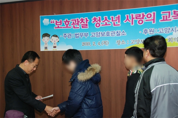 ¹ý¹«ºÎ °í¾çº¸È£°üÂû¼Ò(¼ÒÀå ȲÁø±Ô)´Â 4ÀÏ ¿ÀÀü °í¾çº¸È£°üÂû¼Ò ȸÀǽǿ¡¼­ ¸ð¹ü Çлý º¸È£°üÂû û¼Ò³â 5¸í¿¡°Ô '»ç¶ûÀÇ ±³º¹¡®À» Àü´ÞÇß´Ù.