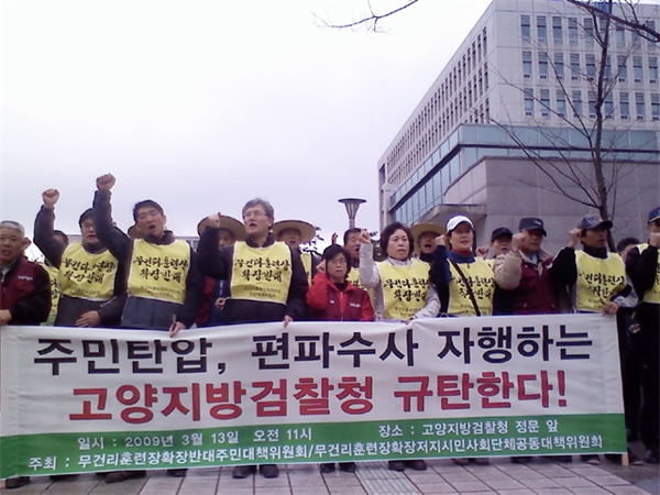 ¹«°Ç¸®ÈÆ·ÃÀåÈ®Àå¹Ý´ëÁֹδëÃ¥À§¿øÈ¸¿Í ¹«°Ç¸®È®ÀåÀúÁö½Ã¹Î»çȸ´Üü°øµ¿´ëÃ¥À§¿øÈ¸(ÀÌÇÏ ¹«°Ç¸® ´ëÃ¥À§)´Â 13ÀÏ ¿ÀÀü °í¾ç½Ã ÀÇÁ¤ºÎÁö¹æ°ËÂûû °í¾çÁöû ¾Õ¿¡¼ ±âÀÚȸ°ßÀ» ¿°í Áö³ÇØ 9¿ù, ÈÆ·ÃÀå È®ÀåÀ» À§ÇØ °¨Á¤Æò°¡¿¡ ³ª¼± ±¹¹æºÎ¿Í Çѱ¹ÅäÁö°ø»çÀÇ °¨Á¤Æò°¡´Ü¿¡ Ç×ÀÇÇÑ Áֹε鿡°Ô ¹ú±ÝÇüÀ» ³»¸° °ËÂûÀÇ ÆíÆÄ¼ö»ç Áß´ÜÀ» Ã˱¸Çß´Ù.