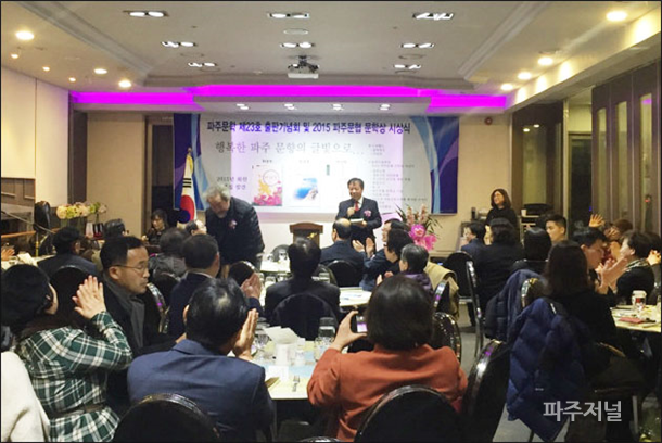 ÆÄÁÖ¹®ÀÎÇùȸ(ȸÀå ÃÖºÀÈñ)´Â 5ÀÏ ¿îÁ¤Çູ¼¾ÅÍ ¹ðŶÇϿ콺¿¡¼­ ¡®ÇູÇÑ ÆÄÁÖ ¹®ÇâÀÇ ±ÛºûÀ¸·Î¡¯¸¦ ³»°É°í ÆÄÁÖ¹®ÇÐ 23È£ ÃâÆÇ±â³äȸ ¹× 2015 ÆÄÁÖ¹®Çù¹®Çлó ½Ã»ó½ÄÀ» °¡Á³´Ù.