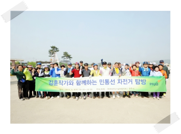 ´ëÇѹα¹À» ´ëÇ¥ÇÏ´Â ±èÈÆ ÀÛ°¡¿Í ÇÔ²² ÇÏ´Â ¹ÎÅë¼± ÀÚÀü°Å ޹æÇà»ç°¡ 9ÀÏ ÀÓÁø° öå¼± µû¶ó ÁøÇàµÆ´Ù. ¼¼°èÀûÀÎ »ýꏰíÀÎ ¹ÎÅë¼± Áö¿ªÀ» ÀÚÀü°Å·Î ޹æ, ÆÄÁÖÀÇ ¿ª»ç*¹®È*ÀÚ¿¬À¯»êÀ» »ìÆìº¸°í ÆòÈ, »ý¸í, °øÁ¸ÀÇ Àǹ̸¦ Á÷Á¢ üÇèÇϱâ À§ÇØ ¸¶·ÃµÈ Çà»ç¿¡´Â ÀÌÀÎÀç ½ÃÀå, À¯º´¼® ÆÄÁÖ½ÃÀÇȸ ÀÇÀå, ¿©»ó±Ã ³óÇù ÆÄÁÖ½ÃÁöºÎÀå, Á¶º¹·Ï Ǫ¸¥ÆÄÁÖ21½ÇõÇùÀÇȸ »óÀÓ´ëÇ¥ µî ±â°ü´ÜüÀå°ú ½Ã¹Î 30¿©¸íÀÌ Âü°¡Çß´Ù. Ǫ¸¥ÆÄÁÖ21½ÇõÇùÀÇȸ°¡ ÁÖ°üÇÑ Çà»ç´Â ÀÓÁø°¢ ÆòÈ´©¸®¿¡¼ Ãâ¹ßÇØ ÅëÀÏ´ë±³-À¾³»¸® »ï°Å¸®-¼°î»ï°Å¸®-ÇÏÆ÷±³-ÇãÁØ ¹¦¼Ò-ÇØ¸¶·çÃÌ-´öÁø»ê¼º À» ¼øÈ¸ÇÏ´Â 38km±¸°£¿¡¼ ¿·È´Ù. ¡®ÀÚÀü°Å ¿©Ç࡯À» ¾´ ±èÈÆ ÀÛ°¡´Â ¡°¹ÎÅë¼± Áö¿ªÀº »ýŰèÀÇ ¸¶Áö¸· º¸°í¶ó ÇØµµ °ú¾ðÀÌ ¾Æ´Ï´Ù¡±¶ó¸ç ¡°Àß º¸Á¸ÇØ Èļյ鿡°Ô ¹°·ÁÁÖ¾î¾ß ÇÏ´Â ½Ã´ëÀû Ã¥ÀÓÀ» ÁöÄÑ ³ª°¡¾ß ÇÑ´Ù¡±°í °Á¶Çß´Ù. ÀÌÀÎÀç ½ÃÀåÀº ¡°ÀÚÀü°Å·Î ޹æÇÏ¸é¼ ÀÚ¿¬ÀÇ ¼ÒÁßÇÔÀ» ÀçÈ®ÀÎÇÏ°Ô µÆ´Ù¡±°í ÀüÇß´Ù. ±èÈÆ ÀÛ°¡´Â ¼Ò¼³°¡, ¹®ÇÐÆò·Ð°¡, Àú³Î¸®½ºÆ®·Î Ȱµ¿ÇßÀ¸¸ç Çѱ¹ÀϺ¸¿Í ÇѰܷ¹½Å¹®¿¡¼ ±âÀÚ»ýȰÀ» ÇÑ ¾ð·ÐÀÎ Ãâ½ÅÀÌ´Ù. »©¾î³ ¹®Ã¼¿Í ±íÀÌ ÀÖ´Â »çÀ¯°¡ µå·¯³ ¹®ÀåÀ¸·Î ¹®ÇÐÆò·Ð°ú ¼öÇÊ, ¼Ò¼³À» ½á¿ÔÀ¸¸ç ¡®Ä®ÀÇ ³ë·¡¡¯ ¡®ÇöÀÇ ³ë·¡¡¯ ¡®ÀÚÀü°Å ¿©Ç࡯ µîÀÇ ÀÛǰ°ú ÃÖ±Ù¿¡´Â ¡®Èæ»ê¡¯À» Æì³Â´Ù. ±èÈÆ ÀÛ°¡´Â Áö³ 2006³â º»Áö°¡ â°£±âȹÀ¸·Î ¸¶·ÃÇÑ ¡®ÀÛ°¡¿ÍÀÇ ¸¸³²¡¯¿¡¼ ÀÚ½ÅÀÇ ±Û ¼¼°è¸¦ ÀüÇѹ٠ÀÖ´Ù.