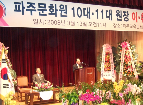 ÆÄÁÖ¹®È¿øÀå ÀÌ-ÃëÀÓ½ÄÀÌ 13ÀÏ ±³À°¹®Èȸ°ü ´ë°´ç¿¡¼ ¼ºÈ²¸®¿¡ ¿·È´Ù. Çà»ç¿¡´Â °æ±âµµ¹®È¿ø ³²¼±¿ì ÁöȸÀå, ½ÉÀçµæ ¼¿ï Á¾·Î±¸¹®È¿øÀå µî Áö¿ª ¹®È¿øÀå, ȲÁøÇÏ ±¹È¸ÀÇ¿ø, À¯È¼± ½ÃÀå, ±èÇüÇÊ ½ÃÀÇȸ ÀÇÀå, ÀåÁ¾ÇÏ ±³À°Àå µî ±â°ü´ÜüÀå, À̱âÇö Àü ¹®È¿øÀå, ¹®È¿ø °ü°èÀÚ 300¿©¸íÀÌ Âü¼®Çß´Ù. Áö³ 2000³â ÃëÀÓ, 8³â Àӱ⵿¾È ÆÄÁÖ¹®È ¹ßÀüÀ» Å©°Ô ¾Õ´ç±ä ½ÅÃá¹ü ¿øÀåÀº ÀÌÀӻ縦 ÅëÇØ "8³âÀ̶ó´Â ªÁö ¾ÊÀº ½Ã°£À» Å« °ú¿À ¾øÀÌ Àӱ⸦ ¸¶Ä¥ ¼ö ÀÖ¾ú´ø °ÍÀº ¹®È¸¦ »ç¶ûÇÏ°í °ü½ÉÀ» °¡Á®ÁØ ºÐµé ´öºÐ"À̶ó¸ç "½ÅÀÓ ¿øÀåÀº ÆÄÁÖ¸¦ »ç¶ûÇÏ´Â ¸¶À½°ú ¿ª·® µîÀ» ¸ðµÎ °®Ãá ºÐÀ¸·Î ÆÄÁÖ¹®È¸¦ ´õ¿í ¹ßÀü½Ãų °ÍÀ¸·Î ±â´ëÇÑ´Ù"°í ¸»ÇÏ°í ±×µ¿¾È µ¿°Åµ¿¶ô(ÔÒËÜÔÒÕ¥)Çß´ø »ç¶÷µéÀ» ÀÏÀÏÀÌ °Å¸íÇÏ¸é¼ °í¸¶¿òÀ» ÀüÇß´Ù. Áö³´Þ ¼±°Å¸¦ ÅëÇØ Á¦11´ë ¿øÀå¿¡ ´ç¼±µÅ À̳¯ ÃëÀÓÇÑ ¹ÎŽ ¿øÀåÀº ÃëÀӻ縦 ÅëÇØ "ÀüÀÓ ¿øÀåÀÇ Á¤¿ÀûÀÎ ³ë·Â°ú Ȱµ¿À¸·Î (ÆÄÁÖ¹®È¿øÀÌ) ÆÄÁÖ ¹®ÈÀÇ Áß½Éü·Î ÀÚ¸®¸¦ Àâ°í ÀÖ´Ù"¸é¼ "Çѹݵµ Á߽ɿ¡ À§Ä¡ÇÑ ÆÄÁÖÀÇ ÀÚ¶û½º·± ¹®ÈÀû ÀüÅëÀ» ÁöŰ°í ¹ßÀü½Ã۵¥ ÃÖ¼±À» ´ÙÇϰڴÙ"°í ¹àÇû´Ù. ¹Î ¿øÀåÀº ¶Ç "(¹®È¿øÀÌ) Áö¿ª¹®È ¹ßÀü°ú ¹®ÈȰµ¿ÀÇ ÁßÃß°¡ µÇµµ·Ï üÁ¦¿Í Á¦µµ¸¦ °³¼±ÇÏ°í ¹®ÈÀÎÇÁ¶ó ±¸Ãà¿¡ ³ë·ÂÇϰڴÙ"°í Àӱ⵿¾È Ȱµ¿¹æÇâÀ» Á¦½ÃÇß´Ù. ±×´Â "ÆÄÁÖ°¡ °¡Áø ¿ª»çÀû, ¹®ÈÀû ÀÚ»êÀ» ¹ÙÅÁÀ¸·Î ¿¾ °ÍÀ¸·ÎºÎÅÍ »õ°ÍÀ» ¹è¿ì¸ç ¹®Çâ ÆÄÁÖÀÇ ÀüÅëÀ» À̾°¥ ¼ö ÀÖµµ·Ï °ü½É°ú Âü¿©"¸¦ ´çºÎÇß´Ù. ¹Î ¿øÀåÀº ÃëÀÓ»ç ¸»¹Ì¿¡¼ "Áö¿ª¹®È ¹ßÀüÀº ÀÚÄ¡´ÜüÀÇ ÀÇÁö°¡ Áß¿äÇÏ´Ù"¸ç À¯È¼± ½ÃÀåÀÇ °ü½É°ú ¹è·Á¸¦ ´çºÎ, ¹Ú¼ö¸¦ ¹Þ¾Ò´Ù. ¹ÎŽ ¿øÀåÀº ±º³»¸é ¹é¿¬¸® Ãâ½ÅÀ¸·Î 98³â ÆÄÁÖ½ÃÀÇȸ ÀÇÀåÀ» ¿ªÀÓÇßÀ¸¸ç ÆÄÁÖ¹®È¿ø À̻縦 Áö³Â´Ù.