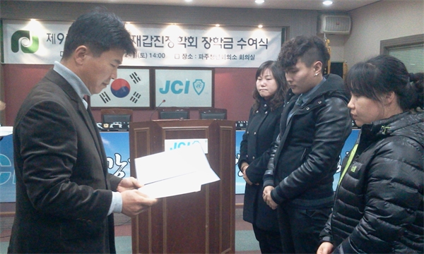 Áö¿ª ÀÎÀç ¾ç¼º¿¡ Å©°Ô ±â¿©Çϰí ÀÖ´Â (Àç)ÆÄÁÖµ·Àç°©ÁøÀåÇÐȸ(ÀÌ»çÀå ±è°©Áø)´Â 24ÀÏ ÆÄÁÖû³âȸÀÇ¼Ò È¸Àǽǿ¡¼­ Á¦9±â ÀåÇÐ±Ý Àü´Þ½ÄÀ» °¡Á³´Ù.