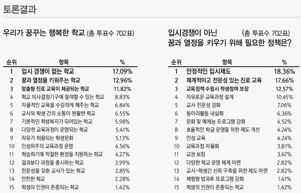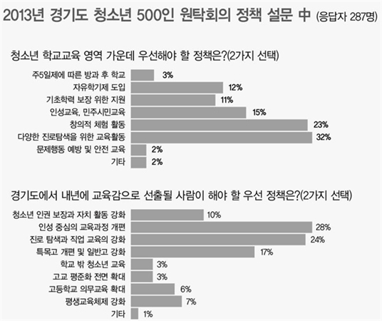 °æ±âµµ û¼Ò³âµéÀº ÀԽà °æÀïÀÌ ¾Æ´Ñ ¡®²Þ°ú ¿Á¤À» Ű¿öÁÖ´Â Çб³¡¯¸¦ ¹Ù¶ó¸ç ¾ÈÁ¤ÀûÀÎ ÀԽà Á¦µµ¿Í ü°èÀûÀÎ Áø·Î ±³À° Á¤Ã¥À» ¿ä±¸ÇÏ´Â °ÍÀ¸·Î ³ªÅ¸³µ´Ù. (»ç)ÇູÇѹ̷¡ ±³À°Æ÷·³(»óÀÓ´ëÇ¥ ÃÖâÀÇ °æ±âµµÀÇȸ ±³À°ÀÇ¿ø)ÀÌ ÃÖ±Ù °æ±â¿µ»ó°úÇаí üÀ°°ü¿¡¼ ÁÖÃÖÇÑ ¡®°æ±âµµ û¼Ò³â 500ÀÎ ¿øÅ¹È¸ÀÇ¡¯¿¡¼ Âü¼®ÇÑ ´ëºÎºÐ °í±³»ýÀÌ ÁÖüÀûÀ¸·Î ±³À°Á¤Ã¥À» Á¦¾ÈÇÏ°í ´Ù¾çÇÑ ÀǰßÀ» ½ñ¾Æ³Â´Ù. À̳¯ ¿øÅ¹Åä·ÐÀº 500¿©¸íÀÇ °íµîÇлýÀÌ 9¸í¾¿ ¿øÅ¹ ¸ðµÒÀ» Æí¼º, 100¿©¸íÀÇ ÆÛ½Ç¸®Å×ÀÌÅÍ(Åä·ÐÃËÁøÀÚ)±³»çµéÀÇ ÁøÇà¾Æ·¡ ¡®¿ì¸®°¡ ²Þ²Ù´Â ÇູÇÑ Çб³¡¯¸¦ ÁÖÁ¦·Î ÀÚ½ÅÀÇ Àǻ縦 ¹àÇû´Ù. ƯÈ÷ 2½ÃºÎÅÍ ÁøÇàµÈ Åä·ÐÀº Æóȸ ¿¹Á¤ÀÎ 5½Ã¸¦ ³Ñ¾î¼´Â µî ÁøÁöÇÏ°Ô ÆîÃÄÁ³´Ù. ¿øÅ¹Åä·Ð¿¡¼ ÇлýµéÀÇ Åä·Ð³»¿ëÀº ÀÎÅͳÝÀ¸·Î ½Ç½Ã°£ ÃëÇÕ*Á¤¸®µÆÀ¸¸ç û¼Ò³âµéÀÌ »ý°¢ÇÏ´Â ÇູÇÑ Çб³ÀÇ ¸ð½ÀÀ¸·Î °¡Àå ¸¹Àº ÇлýÀÌ ¡®Çо÷ºÎ´ãÀ» ÇØ¼ÒÇϰí Çлýµé³¢¸® ³ª´®ÀÌ ÀÖ´Â ÀԽà °æÀï ¾ø´Â Çб³¡¯¸¦ ¼Õ²Å¾Ò´Ù. ´ÙÀ½ ¼øÀ§´Â ¡®²Þ°ú ¿Á¤À» Ű¿öÁÖ´Â Çб³¡¯, ¡®¸ÂÃãÇü Áø·Î ±³À°ÀÌ Á¦°øµÇ´Â Çб³¡¯, ¡®Çб³ ÀÇ»ç°áÁ¤¿¡ ÁÖüÀûÀ¸·Î Âü¿©ÇÒ ¼ö ÀÖ´Â Çб³¡¯, ¡®¿øÇÏ´Â °ú¸ñÀ¸·Î ÀÚÀ²ÀûÀ¸·Î ¼±ÅÃÇÒ ¼ö ÀÖ´Â Çб³¡¯ µîÀ» ¼±Á¤Çß´Ù. ¡®ÇູÇÑ Çб³¸¦ ½ÇÇöÇϱâ À§ÇÑ ±³À°Á¤Ã¥¡¯À¸·Î´Â ¡®°úÁ¤Á᫐ Æò°¡ ¹× ¹è¿ò Á᫐ ¼ö¾÷À» ¾ÈÂøÇÒ ¾ÈÁ¤ÀûÀÎ ÀÔ½ÃÁ¦µµ¡¯¸¦ ¿ä±¸Çß´Ù. ¶ÇÇÑ ÇлýµéÀº üÇè Áß½ÉÀÇ Ã¼°èÀûÀ̰í Àü¹®¼º ÀÖ´Â Áø·Î±³À°°ú ±³À°Á¤Ã¥ ¼ö¸³ ½Ã ÇлýµéÀÇ Âü¿©¸¦ º¸ÀåÇϰí ÀϺΠÇлýµéÀº ±³À°°¨ ÅõÇ¥ Âü¿©±ÇÀ» ÁÖÀåÇØ °ü½ÉÀ» ²ø¾ú´Ù. ¾Æ¿ï·¯ ÇлýµéÀÇ Æ¯¼º¿¡ ¸Â´Â ÀÚÀ¯·Î¿î ±³À°°úÁ¤ ¼³°è, ±³»çµéÀÇ Àü¹®¼ºÀ» ³ô¿© ÁÖÀԽı³À°À» Áö¾çÇϰí Åä·Ð ¹ßÇ¥ ¼ö¾÷À» ÁøÇàÇØ ÁÙ °ÍÀ» Á¦¾ÈÇß´Ù. (»ç)ÇູÇѹ̷¡ ±³À°Æ÷·³Àº ¿øÅ¹È¸ÀÇ¿¡ ¾Õ¼ µµ³» û¼Ò³â 287¸íÀÌ ÀÀ´äÇÑ ±³À°Á¤Ã¥ °ü·Ã 15¹®Ç×ÀÇ ¼³¹®Á¶»ç °á°ú¸¦ ¹ßÇ¥Çß´Ù. ¼³¹®Á¶»ç °á°ú, °æ±â±³À°Á¤Ã¥ °¡¿îµ¥ Àß ¾Ë°í ÀÖ´Â ³»¿ëÀ¸·Î´Â ¡®ÇлýÀαÇÁ¶·Ê¡¯¿Í ¡®ÃÊ*ÁßÇлý ¹«»ó±Þ½Ä¡¯À» ²Å¾ÒÀ¸¸ç ¿À´Â 6¿ù4ÀÏ ¼±ÃâµÉ ±³À°°¨ÀÌ °¡Àå ¿ì¼±ÇØ¾ß ÇÒ Á¤Ã¥À¸·Î´Â ¡®ÀÔ½ÃÀ§ÁÖ°¡ ¾Æ´Ñ ÀμºÁß½ÉÀÇ ±³À°°úÁ¤ °³Æí¡¯°ú ¡®Áø·Î Ž»ö ¹× Á÷¾÷ ±³À° °È¡¯¸¦ ¿ä±¸Çß´Ù. Åä·Ðȸ¸¦ ÁÖ°üÇÑ ÃÖâÀÇ ±³À°ÀÇ¿øÀº ¡°ÇлýµéÀÌ ÁÖü·Î ³ª¼¼ Çб³ ±³À°¿¡ ´ëÇØ Áý´ÜÀûÀ¸·Î ¹®Á¦ÀǽÄÀ» °®°í ³íÀÇÇϰí Á¤Ã¥ ´ë¾È±îÁö Á¦½ÃÇÑ ¼öÁØ ³ôÀº Åä·Ðȸ¿´´Ù.¡±°í Æò°¡ÇÏ°í ¡°¿øÅ¹È¸ÀÇ¿¡¼ Á¦¾ÈµÈ ³»¿ëÀ» ±³À°Ã»Àº ¹°·Ð ÀÚÄ¡´Üü, ±¹È¸¿Í Áö¹æÀÇȸ±â°ü¿¡ Àü´ÞÇØ û¼Ò³âµéÀÌ ¿ä±¸ÇÑ Á¤Ã¥µéÀÌ ¹Ý¿µµÇ°í ½ÇÇöµÉ ¼ö ÀÖµµ·Ï Àû±Ø ³ë·ÂÇϰڴÙ.¡±°í ¹àÇû´Ù. ¿øÅ¹Åä·ÐÀº Àü±¹ÀÇ Áøº¸Àû ¼ºÇâÀÇ Àü*ÇöÁ÷ ±³À°ÀÇ¿ø ¸ðÀÓÀÎ ¡®Àü±¹±³À°ÀÚÄ¡ Æ÷·³¡¯ÀÌ ½Ãµµº° ¸±·¹ÀÌ Çü½ÄÀ¸·Î °³ÃÖÇϰí ÀÖÀ¸¸ç Áö³ 11¿ù 16ÀÏ ÃæºÏ ûÁֽà û¼Ò³â¼ö·Ã°ü, 12¿ù 14ÀÏ ºÎ»ê º¤½ºÄÚ ÄÁº¥¼ÇȦ¿¡¼ ¿·Á, Å« È£ÀÀÀ» ¾ò¾ú´Ù. ÇÑÆí û¼Ò³âµéÀ» ´ë»óÀ¸·Î ½Ç½ÃÇÑ °æ±â±³À°Á¤Ã¥¿¡ °üÇÑ ¼³¹®Á¶»ç °á°ú¿Í Åä·ÐÀ» ÅëÇØ ÃßÃâµÈ û¼Ò³â Á¤Ã¥µéÀº 6.4 Áö¹æ¼±°Å¿¡ Ã⸶ÇÏ´Â ±³À°°¨°ú µµÁö»ç, Áö¹æÀÇ¿øµé¿¡°Ô ¼±°Å °ø¾à¿¡ ¹Ý¿µÇϵµ·Ï Á¦¾ÈÇÒ °èȹÀÌ´Ù. ¿øÈñ°æ ±âÀÚ/ ÀÚ·áÁ¦°ø °í¾ç½Å¹®