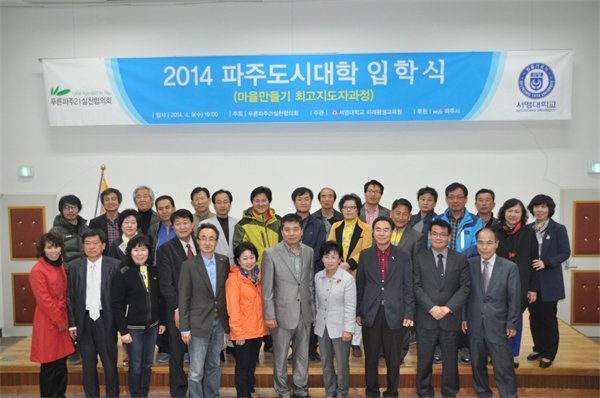 Ǫ¸¥ÆÄÁÖ21½ÇõÇùÀÇȸ(»óÀÓ´ëÇ¥ Á¶º¹·Ï)´Â 9ÀÏ ¼¿µ´ëÇб³¿¡¼ ¡®»ì±â ÁÁÀº ¸¶À» ¸¸µé±â¡¯ ÃÖ°íÁöµµÀÚ ¾ç¼º°úÁ¤ÀÎ ¡®2014³âµµ ÆÄÁÖµµ½Ã´ëÇС¯ °³°½ÄÀ» °¡Á³´Ù. ÆÄÁÖµµ½Ã´ëÇÐÀº Ǫ¸¥ÆÄÁÖ21ÀÌ ÁÖÃÖÇÏ°í ¼¿µ´ëÇб³ ¹Ì·¡Æò»ý±³À°¿øÀÌ ÁÖ°üÇÏ¸ç ¸¶À»º°·Î 3¸íÀÌ ÇÑ ÆÀÀ» ÀÌ·ï ¸¶À»ÀÇ ¾î¸Þ´ÏƼÀÚ¿øÀ» ã¾Æ³»°í ½º½º·Î ¸¶À» ¸¸µé±â °èȹ¾ÈÀ» ÀÛ¼ºÇÏ´Â À̷б³À°°ú ½Ç½ÀÀ» °áÇÕÇÑ ½ºÆ©µð¿À ¹æ½ÄÀ¸·Î ¿À´Â 7¿ù 30ÀϱîÁö 16ÁÖ¿¡ °ÉÃÄ ¸ÅÁÖ ¼ö¿äÀÏ ÁøÇàµÈ´Ù. ±³À°±â°£ µ¿¾È ¸¶À»¸®´õÀÇ ¿ª·®°È¸¦ À§ÇØ ¸®´õ½Ê À̷б³À°°ú ½Ç¹«±³À°, ÇöÀåüÇè°ú Ÿ Áö¿ªÀÇ ¸¶À» ¸¸µé±â »ç·Ê¸¦ ÇнÀÇÏ°í °ü·Ã Àü¹®°¡µé°ú ÇÔ²² ¸¶À»º°·Î ½ºÆ©µð¿À¹æ½ÄÀÇ ±³À°À» ÁøÇà, ¸¶À»°øµ¿Ã¼¸¦ Ȱ¼ºÈÇÏ´Â ½ÇÇà °¡´ÉÇÑ ¸¶À» ¸¸µé±â °èȹÀ» ¼ö¸³ÇÏ´Â ±³À°À» ½Ç½ÃÇÑ´Ù. Ǫ¸¥ÆÄÁÖ21Àº ±³À°°úÁ¤¿¡¼ ¼ö¸³µÈ ¸¶À» ¸¸µé±â °èȹ¾ÈÀ» ½É»ç, ÃÖ¿ì¼ö ÆÀ¿¡°Ô´Â °æ±âµµ °ø¸ð»ç¾÷ÀÎ 2014ÆÄÁÖÃʷϸ¶À»´ëÇÐ »ç¾÷ºñ¸¦ Áö¿øÇØ ÀÚ¿ø ¼øÈ¯Çü ¸¶À» ¸¸µé±â¸¦ ½ÇÇàÅä·Ï ÇÒ °èȹÀÌ´Ù. ÀÔÇнĿ¡¼ Á¶º¹·Ï »óÀÓ´ëÇ¥´Â ¡°»ì±â ÁÁÀº ¸¶À» ¸¸µé±â´Â ¸¶À»À» °¡Àå Àß ¾Æ´Â ¸¶À» ÁöµµÀÚµéÀÌ ³ª¼¼ ÀáÀÚ°í ÀÖ´Â ÁֹεéÀÇ µÎ·¹ÀǽÄÀ» ±ú¿ì´Â °ÍºÎÅÍ Ãâ¹ßÇØ¾ß ÇÑ´Ù.¡±¸ç ¡°»ì±â ÁÁÀº ¸¶À» ¸¸µé±â »ç¾÷ÀÌ Á¤ÂøµÉ ¼ö ÀÖµµ·Ï ³ë·ÂÇØ ´Þ¶ó¡±°í ´çºÎÇß´Ù.