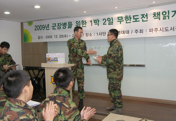 Àß ´Û¿©Áø ½Ç³»¿¡ ¹àÀº Á¶¸í, ¾Æ¸§´Ù¿î ÀÎÅ׸®¾î. ºÎ´ë ³» »çÀÚµµ¼°ü¿¡ µé¾î¼¸é ±º´ë¶ó´Â »ý°¢À» Àá½Ã ÀØ°Ô µÈ´Ù. 2008³â ÆÄÁÖÁß¾Óµµ¼°üÀÇ º´¿µµµ¼°ü Áö¿ø »ç¾÷¿¡ ÈûÀÔ¾î »õ·Ó°Ô ´ÜÀåÇÑ ¸ð½ÀÀÌ´Ù. ƯÈ÷ »çÀÚµµ¼°üÀº ¹®ÈüÀ°°ü±¤ºÎ¿¡¼ ÁÖ°üÇÏ´Â 2009³âµµ Àü±¹µµ¼°ü ¿î¿µÆò°¡¿¡¼ ±¹¹«ÃѸ®»óÀ» ¼ö»óÇÏ´Â ¼º°ú¸¦ °ÅµÎ±âµµ Çß´Ù. Áß¾Óµµ¼°ü¿¡¼´Â 1´Þ¿¡ 2¹ø ¼øÈ¸¹®°í¸¦ ¿°í, ¡®1¹Ú2ÀÏ ¹«ÇѵµÀü Ã¥Àб⡯ Çà»ç¿¡µµ À¯¸í °»çÀÇ Æ¯°À» Áö¿øÇÏ´Â µî ´Ù°¢µµÀÇ Áö¿øÀ» Çϰí ÀÖ´Ù. ¹Ú³ë¼º µµ¼°üÀåÀº ¡°Æ¯°Àº ±ºÀεéÀÇ ¸¸Á·µµ°¡ ¾ÆÁÖ ³ô´Ù.¡±¸ç Áö¼ÓÀûÀÎ ÈÄ¿øÀ» ¾à¼ÓÇß´Ù. ÀÌó·³ µµ¼°üÀÌ »ý±â°í µ¶¼·Î¶ÇÁ¦µµ°¡ µµÀÔµÈ ÀÌÈÄ ºÎ´ë¿øµéÀÇ ÀÏ»óµµ ¹Ù²î±â ½ÃÀÛÇß´Ù. Àϰú ÈÄ PC¹æÀ̳ª ³ë·¡¹æ¿¡¼ ¶§¿ì´ø ½Ã°£À» µµ¼°ü¿¡¼ º¸³»´Â À̵éÀÌ »ý°Ü³ °Í. ºÎ´ëÀåÀÎ ±è±âÈ« Áß·ÉÀº ¹«¾ùº¸´Ù Àü¿ªÀ» ¾ÕµÐ À̵éÀÌ Å« µµ¿òÀ» ¹Þ¾Ò´Ù¸ç ¸¸Á·À» Ç¥ÇÑ´Ù°í ÀüÇß´Ù. ¡°¸¶Áö¸· ¸é´ãÀ» ÇØº¸¸é µµ¼°üÀÌ ÀÖ¾î Æò»ý Àоú´ø °Íº¸´Ù ±º´ë¿¡¼ ´õ ¸¹ÀÌ ÀÐ°í °£´Ù´Â À̾߱⸦ ÇÕ´Ï´Ù. ÀÌÁ¦´Â µ¶¼ÇÏ´Â ±ºÀÎÀÌ °æÀï·Â ÀÖ´Â ±ºÀÎÀÔ´Ï´Ù.¡± ±ººÎ´ë µµ¼°ü Áö¿ø »ç¾÷Àº ½Ã¿Í °æ±âµµ¿¡¼ »ç¾÷ºñ¸¦ ÅõÀÚÇÏ´Â »ç¾÷À¸·Î ±º ÀüÅõ·Â Çâ»ó¿¡ Å©°Ô ±â¿©Çϰí ÀÖ´Ù´Â Æò°¡¸¦ ¹Þ°í ÀÖ´Ù. ³ª¿µÁØ ±âÀÚ