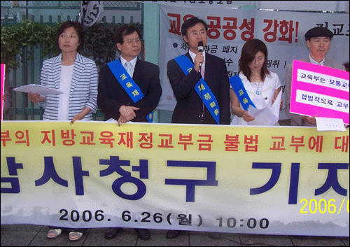 À̳¯ ±âÀÚȸ°ß¿¡¼­ Âü¼®ÀÚµéÀº '±³À°ºÎ°¡ 2006³âµµ Áö¹æ±³À°ÀçÁ¤±³ºÎ±ÝÀ» 16°³ ½Ã¡¤µµ¿¡ ±³ºÎÇϸ鼭 ºÒ¹ýÀûÀ¸·Î °æ±âµµ ¸ò 2õ365¾ï¿ø, ¼­¿ï½Ã ¸ò 1õ551¾ï¿øÀ» »è°¨Çß´Ù"¸é¼­ "Áö³­ 3¿ù °æ±âµµ±³À°°¨°ú ¼­¿ï½Ã±³À°°¨¿¡°Ô ½ÃÁ¤À» ¿ä±¸ÇÏ´Â ÀÌÀǽÅûÀ» Á¦±âÇßÀ¸³ª Áö³­ 5¿ù ±³À°ÀÎÀûÀÚ¿øºÎÀå°üÀÇ Àç·®À̶ó¸ç ±â°¢Çß´Ù"°í ¹àÈ÷°í "Áö¹æ±³À°ÀçÁ¤±³ºÎ±Ý¹ý µî¿¡ µû¶ó ¹èºÐµÇ´Â ±³ºÎ±ÝÀ» ¹ýÀû ±Ù°Å ¾øÀÌ 20%¸¦ »è°¨ÇØ °æ±âµµ¿Í ¼­¿ï½Ã¿¡ ÇÇÇØ¸¦ ÀÔÈù °ÍÀº ¸í¹éÇÑ Å»¹ý"À̶ó°í ÁÖÀåÇϸ鼭 "±³¿ø°ú Çкθ𸦠Áß½ÉÀ¸·Î ±¹¹Î¼­¸íÀÚ¸¦ ¸ðÁý, °¨»ç¿ø¿¡ ±¹¹Î°¨»çû±¸¸¦ Á¦±â·Î Çß´Ù"°í ¹àÇû´Ù.