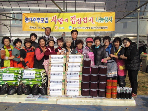 ¿ì¸®½Ã ³óÇù ¿©¼ºÁ¶Á÷ÀÎ ³ó°¡ÁֺθðÀÓ ÆÄÁֽÿ¬ÇÕȸ(ȸÀå ±è¿ÁÁÖ)´Â Áö³ 20ÀÏ ¡®»ç¶ûÀÇ ±èÀå±èÄ¡¡¯ ³ª´® Çà»ç¸¦ °¡Á³´Ù. À̳¯ ¿¬ÇÕȸ´Â ±è¿ÁÁÖ È¸ÀåÀÌ Á÷Á¢ Àç¹èÇÑ ¹èÃß¿Í ¹«¸¦ ÀÌ¿ë, ±èÀå 200kg¿Í ±ïµÎ±â 100kg¸¦ »ç¶ûÀ¸·Î ±èÀå±èÄ¡¸¦ ¹ö¹«·ÈÀ¸¸ç ³ó°¡ÁֺθðÀÓ¿¡ ¸¸µç µÈÀå°ú °øµ¿¼Òµæ»ç¾÷À¸·Î ¼öÈ®ÇÑ µé±â¸§, ½Ò µîÀ» ¼Ò¿Ü°èÃþ 20¿© °¡±¸¿¡ Àü´ÞÇØ ÁÖÀ§¸¦ ÈÆÈÆÇÏ°Ô Çß´Ù. ±è¿ÁÁÖ È¸ÀåÀº ¡°¿¬¸»¿¬½Ã¸¦ ¸Â¾Æ ÀÛÀº Á¤¼ºÀÌ ¼Ò¿Ü°èÃþ¿¡°Ô µû¶æÇÑ °Ü¿ï³ª±â¿¡ º¸ÅÆÀÌ µÇ±æ ¹Ù¶õ´Ù¡±¸ç ¡°È¸¿øµéÀÌ ¼Ò¿Ü°èÃþÀ» µ½´Âµ¥ Àû±Ø ³ª¼³ °Í¡±À̶ó°í ¹àÇû´Ù. À̳¯ Àü´Þ½Ä¿¡´Â ³óÇùÁß¾Óȸ ÆÄÁֽóóÁ¤Áö¿ø´Ü ±èÀçµæ ´ÜÀå°ú À̰¿ì õÇö³óÇù Á¶ÇÕÀå µîÀÌ Âü¼®Çß´Ù.