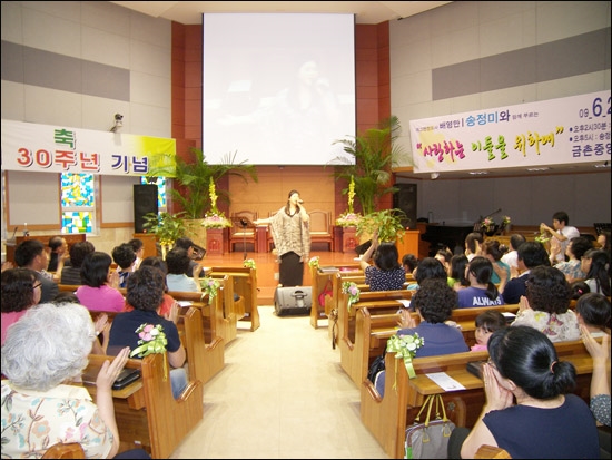 ±ÝÃÌÁß¾Óħ·Ê±³È¸(´ãÀÓ¸ñ»ç ±Ç¼ø·¡)´Â 28ÀÏ Ã¢¸³ 30ÁÖ³âÀ» ¸Â¾Æ °³±×¸Ç ¹è¿µ¸¸¾¾¿Í CCM °¡¼ö ¼ÛÁ¤¹Ì(¼þ½Ç´ë À½´ë)±³¼ö¸¦ ÃÊÃ»ÇØ º¹À½ ÄܼƮ¸¦ ¿¾ú´Ù. ±Ç¼ø·¡ ¸ñ»ç´Â ⸳30Áֳ⠱â³ä¿¹¹è¿¡¼ ¡°30ÁÖ³âÀ» ¸Â¾Æ ¿ì¸® ±³È¸¸¦ ¼¶±â´Â ½ÅµµµéÀÇ ¹ÏÀ½ÀÌ ´õ¿í ½Å½ÇÇÏ°Ô ³ª¾Æ°¡±â¸¦ ¹Ù¶ó¸ç ¼Ò¿ÜµÈ ÀÌ¿ôµé¿¡°Ôµµ Çϳª´ÔÀÇ »ç¶ûÀÌ Àü´ÞµÇ±â¸¦ ¹Ù¶õ´Ù¡±°í ¸»Çß´Ù. ¡®»ç¶ûÇÏ´Â À̸¦ À§ÇÏ¿©¡¯¸¦ ÁÖÁ¦·Î 300¿©¸íÀÇ ½ÅµµµéÀÌ Âü¼®ÇÑ ÄܼƮ´Â ¼ÛÁ¤¹Ì ±³¼öÀÇ º¹À½ ¼º°¡°¡ ¿ï·ÁÆÛÁöÀÚ °¨µ¿°ú ¿±â·Î ¶ß°Å¿ü´Ù.(»çÁø) ±ÝÃÌÁß¾Óħ·Ê±³È¸´Â 1979³â ¾Æµ¿µ¿ ´Ù¶ô¹æ¿¡¼ ⸳¿¹¹è¸¦ °®°í ±Ç¼ø·¡ ¸ñ»ç¸¦ Áß½ÉÀ¸·Î ²ÙÁØÈ÷ ¼ºÀåÇßÀ¸¸ç, »çȸºÀ»ç¿¡ ¾ÕÀå¼ °æ·Î¹«·á±Þ½Ä, µÎ¶õ³ë ¾Æ¹öÁö ±³½Ç ¿î¿µ µî ÀÌ¿ôÀ» À§ÇØ Âü»ç¶ûÀ» ½ÇÃµÇØ¿Ô´Ù. ¶Ç Àú¼ÒµæÃþ°ú »õÅ͹Î, °á¼Õ°¡Á¤ ¾Æµ¿µéÀ» À§ÇØ Áö¿ª¾Æµ¿¼¾ÅÍ '»ç¶ûÀÇ ²ÞÅÍ'¸¦ ¿î¿µ, ¹æ°úÈÄ °¢ Çг⠴ãÀÓÁ¦·Î º¸ÃæÇнÀ°ú ÄÄÇ»Åͱ³½Ç, ¿µ¾î, ÇǾƳë, ¹Ì¼ú, Á¾ÀÌ Á¢±â µî Ư±âÀû¼º±³À°À» ½Ç½ÃÇϰí ÀÖ¾î Áö¿ª»çȸ¿¡ »ç¶ûÀÇ ³ª´®ÅͰ¡ µÇ°í ÀÖ´Ù.
