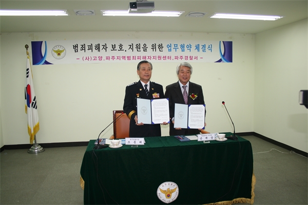 ¹üÁËÇÇÇØÀÚÁö¿ø¼¾ÅÍ °í¾ç*ÆÄÁÖ¼¾ÅÍ¿Í ÆÄÁÖ°æÂû¼´Â 4ÀÏ ÆÄÁÖ°æÂû¼ ȸÀǽǿ¡¼ ¹üÁËÇÇÇØÀÚ ±¸È£*Áö¿øÀ» À§ÇÑ ¾÷¹«Çù¾àÀ» ü°áÇß´Ù.