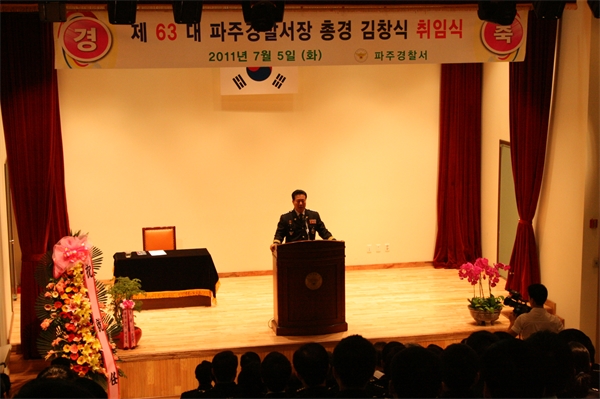 ÆÄÁÖ°æÂû¼­ ±èâ½Ä ¼­Àå ÃëÀÓ½ÄÀÌ 5ÀÏ ¿ÀÈÄ °æÂû¼­ °­´ç¿¡¼­ Á÷¿ø µîÀÌ Âü¼®ÇÑ °¡¿îµ¥ ¿­·È´Ù.