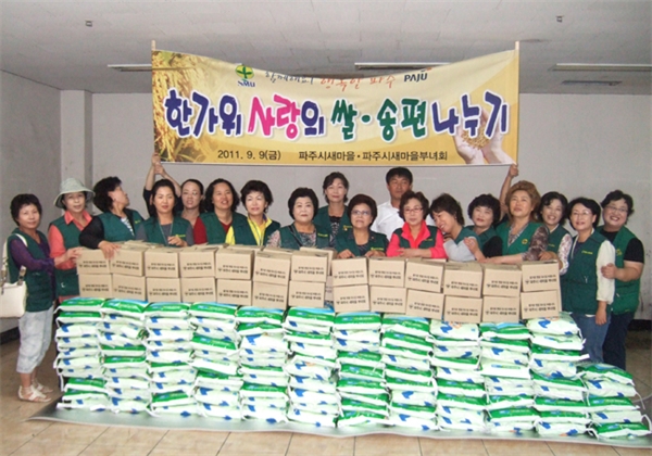 ÆÄÁֽûõ¸¶À»ºÎ³àȸ(ȸÀå ¼ÛºÐ¿¬)´Â 9ÀÏ ¿ÀÀü »õ¸¶À»È¸°ü¿¡¼ °ü³» À¾¸éµ¿ ºÎ³àȸÀå µîÀÌ Âü¼®ÇÑ °¡¿îµ¥ ¹ÎÁ· ÃÖ´ë ¸íÀý ÇѰ¡À§¸¦ ¸Â¾Æ ¡®»ç¶ûÀÇ ½Ò¡¯°ú ¼ÛÆí ³ª´©±â Çà»ç¸¦ °¡Á³´Ù. À̳¯ ³ª´® Ȱµ¿Àº ¼Ò¿Ü°èÃþ¿¡ ÀÌ¿ô»ç¶ûÀ» ÇÔ²² ³ª´©¸ç ¿ë±â¿Í Èñ¸ÁÀ» Àü´ÞÇÏ´Â ¡®ÇØÇÇ ÄÚ¸®¾Æ¡¯¿îµ¿ÀÇ ÀÏȯÀ¸·Î ´õºÒ¾î »ì¾Æ°¡´Â °øµ¿Ã¼ »çȸ ±¸ÇöÀ» ½ÇõÇϱâ À§ÇØ ¸¶·ÃµÆ´Ù. ºÎ³àȸ´Â ¡®»ç¶ûÀÇ ½Ò¡¯ 250Æ÷(10kg)¿Í ¼ÛÆí 300¹Ú½º µî 1õ150¸¸¿ø »ó´çÀÇ ¹°Ç°À» ¸¶·Ã, °¢ À¾¸éµ¿ ºÎ³àȸ¸¦ ÅëÇØ ¼Ò³â¼Ò³à°¡Á¤, Ȧ·Î »ç´Â ¾î¸£½Å, Àå¾ÖÀΰú ÃÖ±Ù ¼öÇØ·Î °íÅëÀ» °Þ°í ÀÖ´Â ÀÌ¿ô¿¡°Ô Àü´ÞµÆ´Ù. ¼ÛºÐ¿¬ ºÎ³àȸÀåÀº ¡°ÀÛÀº ¼±¹°ÀÌ ¾î·Á¿î ÀÌ¿ô¿¡°Ô Èñ¸Á°ú ¿ë±â°¡ µÆÀ¸¸é ÁÁ°Ú´Ù¡±¸é¼ ¡°ºÎ³àȸ¿øµéÀÌ Âü¿©¿Í ¿Á¤À¸·Î ¸¶·ÃÇÑ ¼±¹°À̴ϸ¸Å ¿ÃÇØ ÇѰ¡À§´Â ´õ¿í dz¼ºÇÒ °Í¡±À̶ó°í ¸»Çß´Ù. ÀÌÀ翵 »õ¸¶À»ÁöµµÀÚÇùÀÇȸÀåÀº "³ª´®Àº ÇູÀÇ ½ÃÀÛ'À̶ó¸ç "¼Ò¿Ü°èÃþÀ» À§ÇÑ ³ª´® Ȱµ¿Àº Áö¼ÓµÉ °Í"À̶ó°í ¸»Çß´Ù.