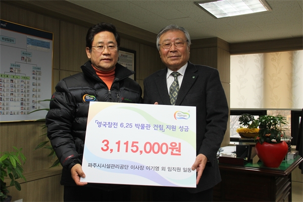ÆÄÁֽýü³°ü¸®°ø´Ü(ÀÌ»çÀå À̱⿵)Àº '¿µ±¹ 6.25 ¹Ú¹°°ü °Ç¸³' Áö¿ø±â±ÝÀ¸·Î 300¿©¸¸ ¿øÀ» ¼Û´Þ¿ë °Ç¸³Áö¿øÀ§¿øÈ¸ À§¿øÀå¿¡°Ô ±âŹÇß´Ù. ±â±ÝÀº ÀÓÁ÷¿øµéÀÌ ½Ê½ÃÀϹÝÀ¸·Î ¸¶·ÃÇÑ ¼º±ÝÀ¸·Î ¿µ±¹ Ŭ·Î½ºÅͽÿ¡ ¼¼¿öÁú 6.25 ¹Ú¹°°ü °Ç¸³ ±â±ÝÀ¸·Î Àü´ÞµÉ ¿¹Á¤ÀÌ´Ù.