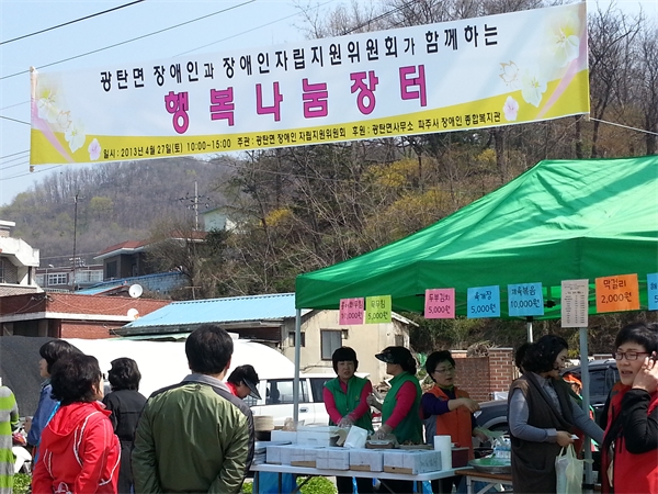 Àå¾ÖÀÎ ÀÚ¸³ÃËÁø°ú ÀÚȰÀ» µ½°í ÀÖ´Â ±¤Åº¸é Àå¾ÖÀÎÀÚ¸³Áö¿øÀ§¿øÈ¸(À§¿øÀå ÇÏ¿ë¼ö)°¡ ÁÖÃÖÇÏ´Â 'Çູ ³ª´® ÀåÅÍ'°¡ 27ÀÏ ±¤Åº³óÇù ÁÖÂ÷Àå¿¡¼­ ÀåÀ» ¿­¾ú´Ù.