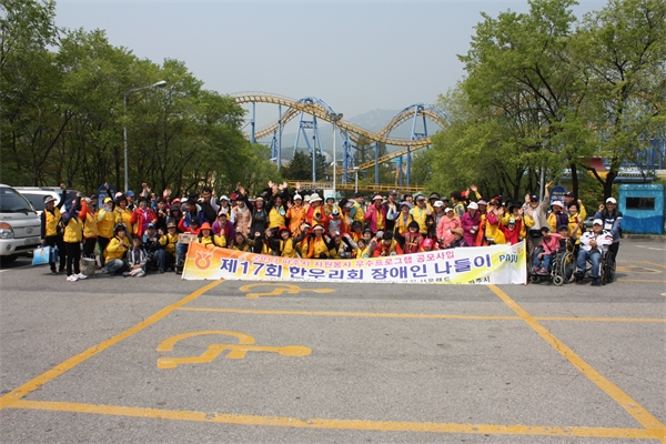 ÆÄÁÖ¿¬ÃµÃàÇù Çѿ츮ÇùÀÇȸ(ȸÀå °í¸í¼÷)´Â 7ÀÏ °úõ ¼¿ï·£µå¿¡¼ ¡®Á¦ 17ȸ Àå¾ÖÀÎ ³ªµéÀÌ¡¯ Çà»ç¸¦ °¡Á³´Ù. ¡®»ç¶û ³ª´®! Çູ³ªµéÀ̸¦ ÁÖÁ¦·Î ¿¸° ³ªµéÀÌ´Â Àå¾ÖÀÎ °¡Á·µé¿¡°Ô µû¶æÇÑ °ü½É°ú »ç¶ûÀ» ÀüÇϰí ÇÔ²² ´õºÒ¾î »ç´Â »çȸ°øµ¿Ã¼ ±¸ÇöÀ» À§ÇØ ¸¶·ÃµÆ´Ù. À̳¯ Çà»ç¿¡¼ Çѿ츮ÇùÀÇȸ ȸ¿øµéÀº Àå¾ÖÀεéÀÇ ¼Õ°ú ¹ßÀÌ µÇ°í ¾ö¸¶ ¿ªÇÒ·Î ¡®¾Æ¸§´Ù¿î ºÀ»ç¡¯¸¦ ½ÇõÇß´Ù. ³îÀÌüÇè¿¡¼´Â µû½ºÇÑ °¡½¿À¸·Î ÇÔ²² ¾î¿ï¸®¸ç Àå¾Ö¶ó´Â Æí°ßÀÇ º®À» Ç㹫´Â ¼ÒÁßÇÑ ½Ã°£À» º¸³Â´Ù. ¶ÇÇÑ È¸¿øµéÀÌ ¼Õ¼ö ¸¶·ÃÇÑ Á¡½É°ú °£½ÄÀ» ÇÔ²² ³ª´©¸ç ¸ðó·³ ³ªµéÀÌ¿¡ ³ª¼± Àå¾ÖÀε鿡°Ô ÇÔ¹Ú¿ôÀ½À» ÀüÇß´Ù. °í¸í¼÷ ȸÀåÀº ¡°Àå¾ÖÀε鿡°Ô »çȸüÇèÀ» ÅëÇØ ²Þ°ú ¿ë±â¸¦ ÁÖ´Â ½Ã°£¡±À̶ó¸ç ¡°Çظ¼Àº ¸ð½ÀÀ¸·Î Áñ°Ì°Ô ¿ô°í ¶°µå´Â ¸ð½ÀÀ» º¸¸é¼ º¸¶÷À» ´À³¤´Ù¡±°í ¸»Çß´Ù. Çà»ç¿¡´Â ¾îÀ¯Áö µ¿»ê(Àû¼º), °ÜÀÚ¾¾ »ç¶ûÀÇ Áý(±¤Åº), ÁÖº¸¶óÀÇ Áý(¹®»ê), ÁÖ¶÷µ¿»ê(±¤Åº), ÁÖ°£Àå¾ÖÀκ¸È£¼¾ÅÍ(±ÝÃÌ) µî 8°÷ÀÇ Àå¾ÖÀνü³ ¿ø»ý 110¸í°ú Çѿ츮ÇùÀÇȸ ȸ¿ø, ÀÚ¿øºÀ»ç´Üü ȸ¿ø µî 240¿©¸íÀÌ Âü¿©Çß´Ù.