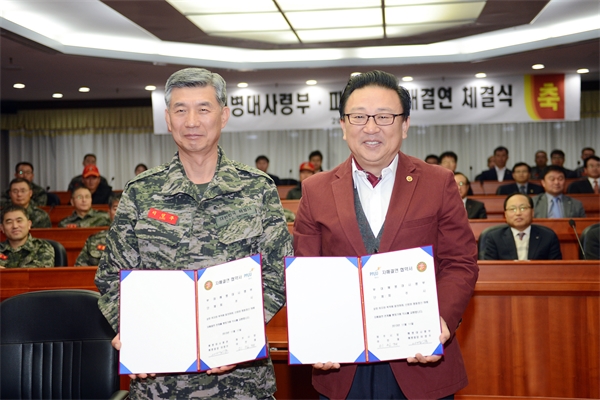 À̳¯ °á¿¬¿¡´Â ÀÌÀÎÀç ½ÃÀå, ¹ÚÂùÀÏ ÆÄÁÖ½ÃÀÇȸ ÀÇÀå µî ÆÄÁֽà °ü°èÀÚ¿Í ÀÌ¿µÁÖ ÇØº´´ë»ç·É°ü µî ÇØº´´ë °ü°èÀÚ°¡ Âü¼®Çß´Ù. ¾ç ±â°üÀº °á¿¬À» ÅëÇØ ½Å·Ú¿Í Çùµ¿Á¤½ÅÀ» ¹ÙÅÁÀ¸·Î ´ë¹ÎÁö¿ø »ç¾÷, ¾Èº¸ÇöÀå üÇè Çà»ç, ºÎ´ëÀ庴 ÃÊû Çà»ç µî »ó»ý ¹ßÀüŰ·Î ?´Ù. °á¿¬¿¡¼ ÀÌÀÎÀç ½ÃÀåÀº "´ëÇѹα¹ ±¹±ºÀÇ ÃÖÁ¤¿¹ºÎ´ëÀÎ ÇØº´´ë¿Í ÀڸŰῬÀº »ó´çÇÑ Àǹ̰¡ ÀÖ´Ù"¸é¼ "°á¿¬À» ÅëÇØ ¹Î*±º °ü°è°³¼±¿¡ Å©°Ô ±â¿©ÇÒ °ÍÀ¸·Î ±â´ëµÈ´Ù"°í ¸»Çß´Ù. ÀÌ¿µÁÖ »ç·É°üÀº "ÆÄÁÖ´Â ÇØº´´ë â¼³°ú Àο¬ÀÌ ±íÀº °÷"À̶ó¸ç "¾ç ±â°üÀÌ ¾Èº¸*Æòȸ¦ À§ÇØ »óÈ£ ¹ßÀüÇÏ´Â °è±â°¡ µÇ±æ ¹Ù¶õ´Ù"°í ¸»Çß´Ù. ÇØº´´ë´Â Çѱ¹ÀüÀïÀÌ Ä¡¿Çß´ø Áö³ 52³â, Á¦1ÀüÅõ´Ü(Çö ÇØº´ 1»ç´Ü)À¸·Î Æí¼ºµÅ ÆÄÁֽà ¾Æµ¿µ¿(Çö 28¿¬´ë ÀÚ¸®)¿¡¼ ±¹Åä ¹æÀ§¿¡ Àü³äÇÏ´Ù Áö³ 55³â 1¿ù, Á¦1»ó·ú»ç´ÜÀ¸·Î ÁõÆíµÇ¸é¼ 59³â Çö Æ÷Ç׽÷ΠÀÌÀüÇß´Ù. ¶ÇÇÑ 58³âµµ ¹®»êÁ¾°í(Çö ¹®»êÁ¦Àϰí) Á¹¾÷»ý °¡¿îµ¥ ´ëÇÐ ÁøÇлý°ú ±º ¸éÁ¦ÀÚ¸¦ Á¦¿ÜÇÑ Á¹¾÷»ý Àü¿øÀÌ ÇØº´´ë(80±â)¿¡ ÀÔ´ëÇÏ´Â Àü¹«ÈĹ«ÇÑ ¿ª»ç¸¦ °®°í ÀÖ´Ù. ÇöÀç ÆÄÁֽà °ü³»¿¡´Â ÇØº´ Á¦1»ó·ú»ç´Ü Àü°ø¼±¾çºñ¸¦ ºñ·ÔÇØ ÇØº´´ë ÆÄ·Îºñ, ÇѹÌÇØº´ ÂüÀüºñ, ÇØº´´ë ¼öµµ¹æÀ§ ±â°øºñ µî ÇØº´ ¿ª»ç°¡ ³²¾ÆÀÖ´Ù.