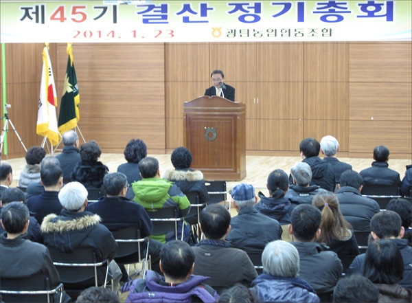 ±¤Åº³óÇù(Á¶ÇÕÀå ¹éÁ¶Çö)Àº 23ÀÏ ´ëȸÀǽǿ¡¼ 45±â Á¤±â °á»êÃÑȸ¸¦ ¿°í 2013³â °á»êº¸°í ¹× À׿©±Ý óºÐ ½ÂÀÎ ¾È°Ç°ú ºñ»óÀÓ ÀÌ»ç ¼±Ãâ µî ¾È°ÇÀ» ½ÉÀÇ*ÀǰáÇß´Ù. ÃÑȸ¿¡´Â ¹é»ó±â Àü Á¶ÇÕÀåÀ» ºñ·ÔÇÑ ÀÌ»ç, ´ëÀÇ¿ø 200¿©¸í°ú ±èÀçµæ ³óÇù ÆÄÁÖ½ÃÁöºÎ ³óÁ¤Áö¿ø´ÜÀå, À̰ÇÈñ ±¤Åº¸éÀå, ¹ÚÁ¤ ¹ÎÁÖ´ç ÆÄÁÖÀ»Áö±¸´çÀ§¿øÀå µî ±â°ü´ÜüÀåÀÌ Âü¼®Çß´Ù. Á¤±âÃÑȸ¿¡¼ ¹éÁ¶Çö Á¶ÇÕÀåÀº Àλ縻À» ÅëÇØ ¡°¿ÃÇØ´Â ¾î·Á¿î ȯ°æÀÌÁö¸¸ ¾ÈÁ¤µÈ ±â¹Ý À§¿¡¼ »ç¾÷À» ¼ºÀå½ÃŰ´Â µµ¾àÀÇ ÇØ·Î »ï°Ú´Ù¡±¸é¼ ¡°Á¶ÇÕ¿ø¿¡°Ô ÃÖ´ë ÀÌÀÍÀÌ È¯¿øµÇ°í (³óÇùÀº)Áö¿ª»çȸÀÇ °æÁ¦, »çȸ, ¹®ÈÀÇ Áß½Éü·Î ¿ªÇÒÀ» Ãæ½ÇÈ÷ ¼öÇàÇØ ³ª°¡°Ú´Ù¡±°í ¸»Çß´Ù. ¶Ç ¹é Á¶ÇÕÀåÀº ¡°³» Á¶ÇÕÀ̶ó´Â ÁÖÀÎÀǽÄÀÌ È®°íÇØ¾ß Çϰí ÅëÀå°Å·¡, ¸¶Æ® ¹°°Ç Çϳ »ç´Â °Íµµ ³óÇù Àü »ç¾÷À» ÀÌ¿ëÇØÁÖ±æ ¹Ù¶õ´Ù¡±°í ´çºÎÇß´Ù. À̳¯ ¿ø»êÁöÇ¥½Ã µî ³ó½Äǰ À¯Åë°ü¸®¸¦ ÅëÇØ ³ó¸²Ãà»ê½Äǰ»ê¾÷ ¹ßÀü¿¡ ±â¿©ÇÑ ±è¼ºÀÏ »óÀÓÀ̻簡 ³ó¸²Ãà»êºÎÀå°ü»ó ǥâÀ» ¹ÞÀº °ÍÀ» ºñ·Ô, »ç¾÷ºÎ¹®º° ¿ì¼öÁ¶ÇÕ¿ø¿¡°Ô °¨»çÆÐ, Æ÷âÀå, °ø·ÎÆÐ°¡ ¼ö¿©µÆ´Ù. ±¤Åº³óÇùÀº Àüü ±ÝÀ¶±Ç °æ¿µ¾ÇÈ·Î ½ÇÀûÀÌ ÀúÁ¶ÇÑ °¡¿îµ¥µµ ºÒ±¸, Àü³âµµ ´ëºñ 50% °á»êÀÌÀÍÀ» °ÅµÖ ÈæÀÚ°á»êÀ» ³»´Â ¼º°ú¸¦ ¿Ã·È´Ù. ÇѼºÈñ ±âÀÚ