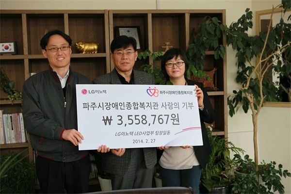 LGÀ̳ëÅØ LED»ç¾÷ºÎ Á÷¿øµéÀÌ Àú¼ÒµæÀå¾ÖÀο¡°Ô °¡ÀüÁ¦Ç°À» Áö¿ø, ¡®³» °íÀå »ç¶û¡¯À» ½ÇõÇÏ¸é¼ ÁÖÀ§¸¦ ÈÆÈÆÇÏ°Ô Çß´Ù. LGÀ̳ëÅØ LED»ç¾÷ºÎ Á÷¿øµéÀº Áö³´Þ 27ÀÏ ÆÄÁÖ½ÃÀå¾ÖÀÎÁ¾ÇÕº¹Áö°ü(°üÀå Á¤Çмö)À» ¹æ¹®, LED-TV, ¼¼Å¹±â µî °¡ÀüÁ¦Ç° 355¸¸¿© ¿ø »ó´çÀ» ±âºÎÇß´Ù. À̳¯ ±âºÎµÈ »ç¶ûÀÇ °¡ÀüÁ¦Ç°Àº Á÷¿øµéÀÌ ½Ê½ÃÀÏ¹Ý ¸¶·ÃÇÑ ¼º±ÝÀ¸·Î Áغñ, Àú¼ÒµæÀå¾ÖÀÎ 7°¡Á¤¿¡ Àü´ÞµÆ´Ù. Àå¾ÖÀκ¹Áö°ü °ü°èÀÚ´Â ¡°(»ç¶ûÀ» Àü´Þ¹ÞÀº) Àå¾ÖÀΰ¡Á¤Àº ¼¼Å¹±â, ³ÃÀå°í, ÄÄÇ»ÅÍ, TV µî »ýȰ°ú ±³À°¿¡ ²À ÇÊ¿äÇÑ ÀüÀÚÁ¦Ç°ÀÌ ¾ø¾î ¾î·Á¿òÀ» °Þ°í ÀÖ¾ú´Ù¡±¸ç ¡°¾ÈŸ±î¿î »ç½ÇÀ» ¾Ë°Ô µÈ LGÀ̳ëÅØ Á÷¿øµéÀÌ ¸ð±ÝÀ» ÅëÇØ ÈÄ¿ø±ÝÀ» ¸¶·ÃÇÑ °Í¡±À̶ó¸ç °í¸¶¿òÀ» ÀüÇß´Ù. LGÀ̳ëÅØ ¹®¼ºÁÖ ¿¬±¸À§¿øÀº ¡°ÀÛÁö¸¸ »ç¶ûÀ» ³ª´©°íÀÚ ÇÏ´Â Á÷¿øµéÀÇ ¼ÒÁßÇÑ ¸¶À½ÀÌ ¸ð¿© ÁÁÀº °á°ú¸¦ ¸¸µé ¼ö ÀÖ¾ú´Ù¡±¸ç ¡°¾ÕÀ¸·Îµµ ´õ ¸¹Àº ³ª´®À» ½ÇõÇϴµ¥ ³ë·ÂÇØ ³ª°¥ °Í¡±À̶ó°í ¸»Çß´Ù.