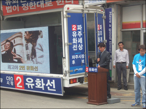 À¯È¼± È帴 "´ëÇѹα¹ ´ëÇ¥µµ½Ã·Î Å»¹Ù²Þ½ÃŲ ÆÄÁÖ¸¦ Àü±¹¿¡¼ °¡Àå »ì±âÁÁÀº µµ½Ã·Î ¸¸µé°Ú´Ù"¸ç À¯±ÇÀڵ鿡°Ô ÀÏÀÏÀÌ ¾Ç¼öÇϸç ÁöÁö¸¦ È£¼ÒÇß´Ù.